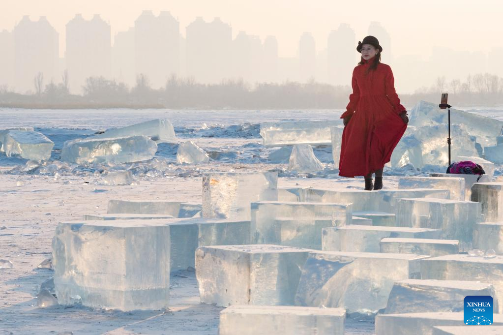 A tourist poses for photos on ice cubes at a section of Songhuajiang River in Harbin, northeast China's Heilongjiang Province on Feb. 1, 2023. This section of frozen river used to be the source of natural ice for installations at the Harbin Ice and Snow World. Some giant ice cubes were cut out but left there unused. (Xinhua/Xie Jianfei)