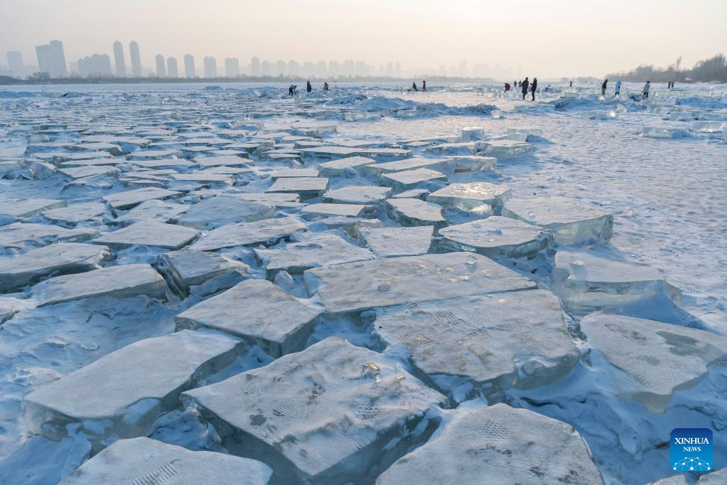 This phote taken on Feb. 1, 2023 shows ice cubes at a section of Songhuajiang River in Harbin, northeast China's Heilongjiang Province. This section of frozen river used to be the source of natural ice for installations at the Harbin Ice and Snow World. Some giant ice cubes were cut out but left there unused. (Xinhua/Xie Jianfei)