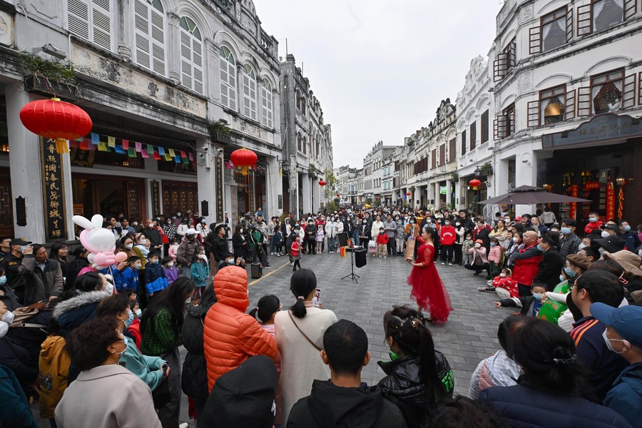 Tourists enjoy performance at the Qilou ancient street during the Spring Festival holiday in Haikou, south China's Hainan Province, Jan. 27, 2023. (Xinhua/Guo Cheng)