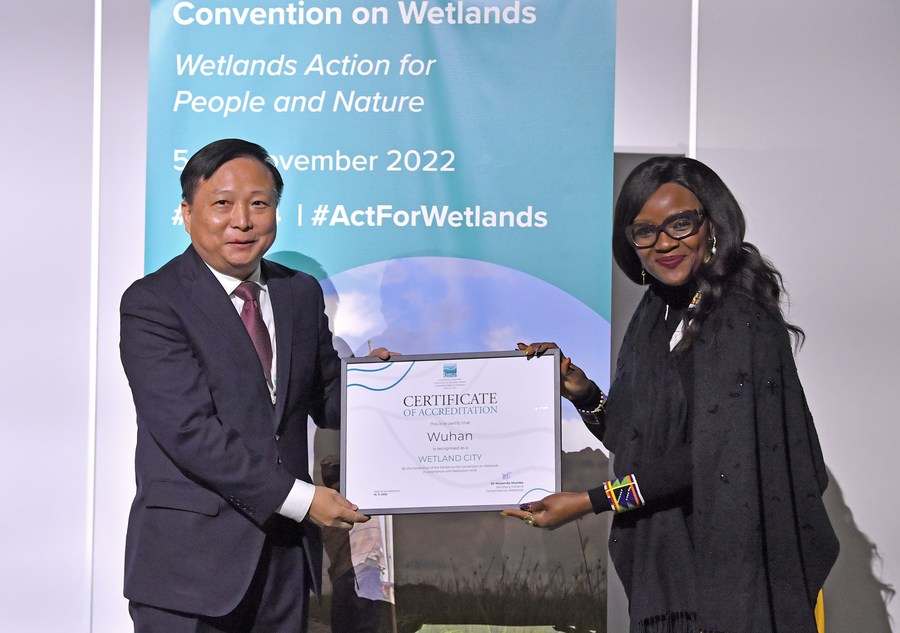 Musonda Mumba (R), secretary-general of the Ramsar Convention, gives the certificate of accreditation that recognises Wuhan of central China's Hubei Province as the international wetland city to a Chinese representative during the 14th Meeting of the Conference of the Contracting Parties (COP14) to the Ramsar Convention on Wetlands, in Geneva, Switzerland, Nov. 10, 2022. (Xinhua/Lian Yi)