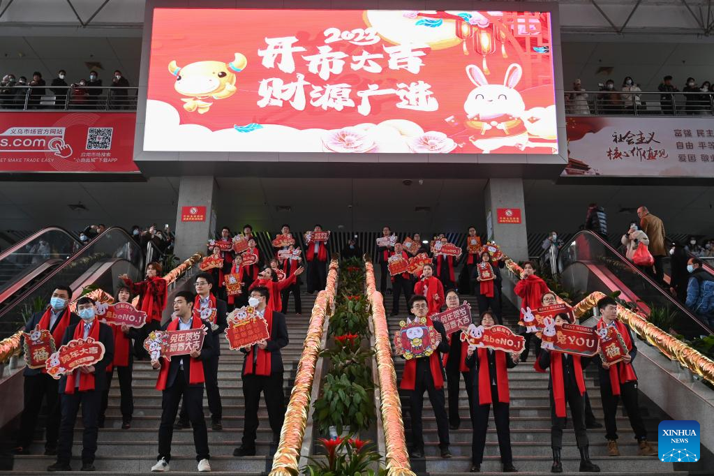 Merchant delegates perform during celebrations to welcome the first business day in the Year of the Rabbit at the International Trade Market in Yiwu City, east China's Zhejiang Province, Feb. 2, 2023. About 75,000 merchants at the Yiwu International Trade Market on Thursday welcomed their first business day in the Year of the Rabbit.(Xinhua/Huang Zongzhi)