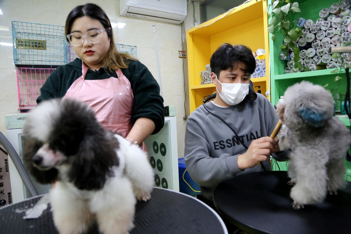 Employees groom dogs at a pet boarding store in Lianyungang, Jiangsu province. [WANG CHUN/FOR CHINA DAILY]