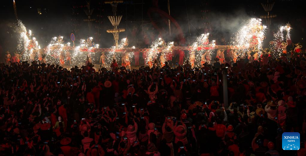 People watch fireworks dragon performance at Jiedong District of Jieyang City, south China's Guangdong Province, Jan. 31, 2023. (Photo by Huang Guangping/Xinhua)