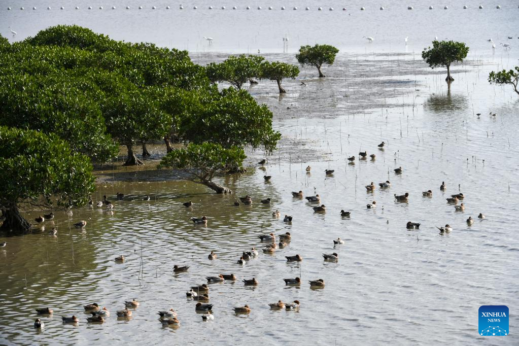 Birds are observed at a mangrove wetland in Futian, Shenzhen, south China's Guangdong Province, Feb. 1, 2023. (Xinhua/Liang Xu)