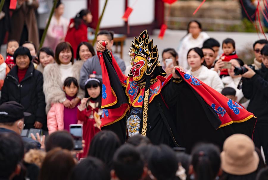 Visitors watch colorful folk performances in Xiannvhu district, Xinyu city in east China's Jiangxi province on Feb 1, 2023.. (Photo: China News Service/ Zhao Chunliang)
