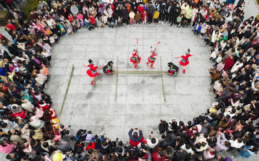 Visitors watch colorful folk performances in Xiannvhu district, Xinyu city in east China's Jiangxi province on Feb 1, 2023.. (Photo: China News Service/ Zhao Chunliang)