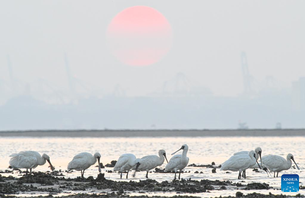 A flock of black-faced spoonbills are observed at Danzhou Bay Wetland in Danzhou, south China's Hainan Province, Dec. 13, 2022. February 2 marks World Wetlands Day. A total of 32,036 water birds of 71 species were observed during a latest annual survey of water birds wintering in Hainan. Among them, 201 black-faced spoonbills were recorded, the highest number since the survey of wintering water birds began in 2003. (Xinhua/Pu Xiaoxu)