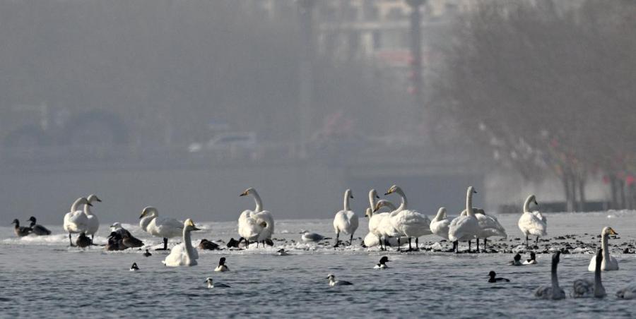Hundreds of swans rest on the Peacock River in Korla city, northwest China's Xinjiang Uygur autonomous region, Feb 2, 2023. (Photo: China News Service/ Que Hure)