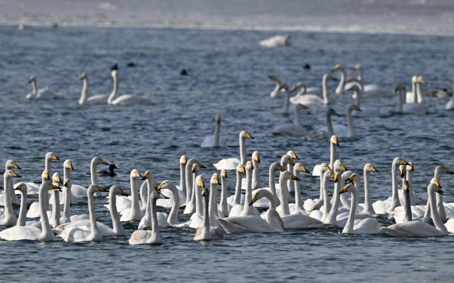 Hundreds of swans rest on the Peacock River in Korla city, northwest China's Xinjiang Uygur autonomous region, Feb 2, 2023. (Photo: China News Service/ Que Hure)