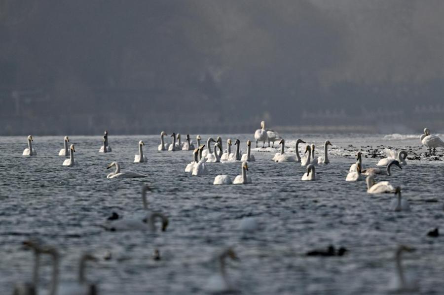 Swans rest on the Peacock River in Korla city, northwest China's Xinjiang Uygur autonomous region, Feb 2, 2023. (Photo: China News Service/ Que Hure)