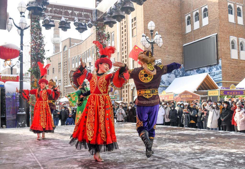 Performers dance at the grand bazaar in Urumqi, northwest China's Xinjiang Uygur Autonomous Region, Jan. 23, 2023. (Xinhua/Wang Fei)