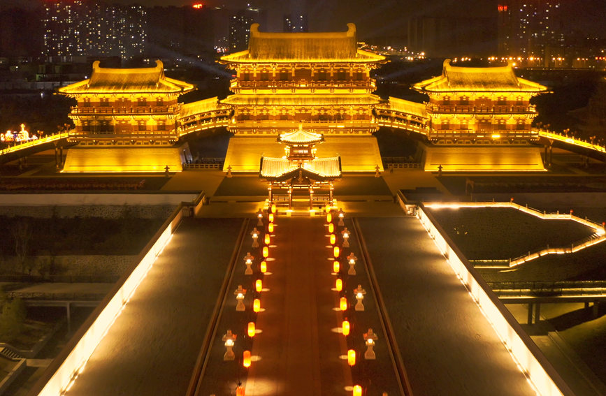The Sui and Tang Dynasties Luoyang City National Heritage Park in Luoyang, central China’s Henan Province, is illuminated. (People’s Daily Online/Zhang Xian)
