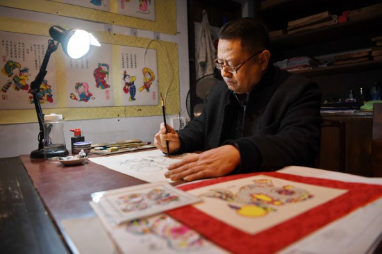 An artist makes woodblock New Year paintings at the Wuqiang woodblock New Year painting museum in Wuqiang County, north China's Hebei Province, Feb. 3, 2023. (Xinhua/Mu Yu)