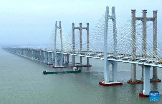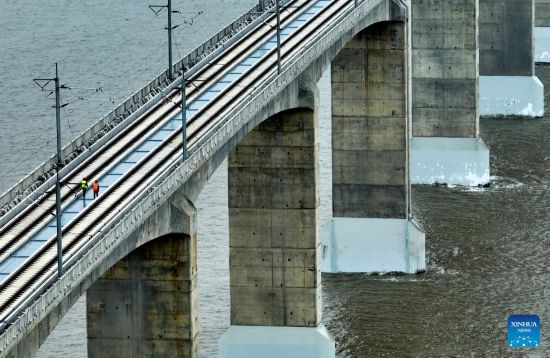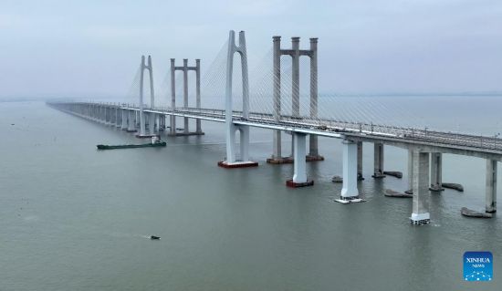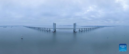 This aerial photo taken on Feb. 4, 2023 shows the Quanzhou Bay cross-sea bridge, a part of the Fuzhou-Xiamen high-speed railway, in southeast China's Fujian Province.