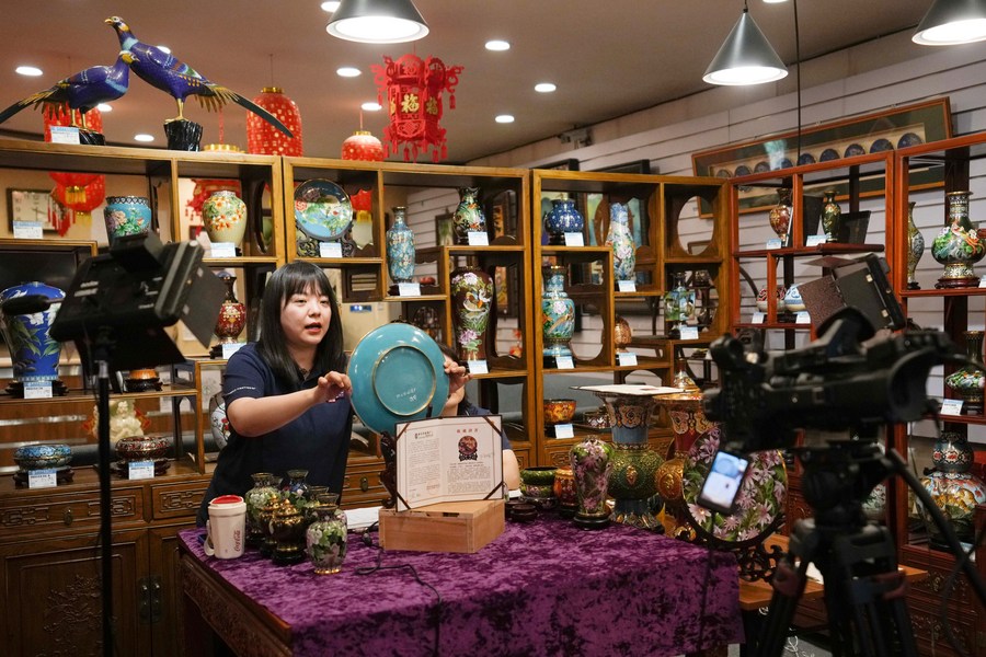 A staff member promotes cloisonne handicrafts through livestreaming at Beijing Enamel Factory Co., Ltd. in Beijing, capital of China, June 18, 2022. (Xinhua/Ju Huanzong)