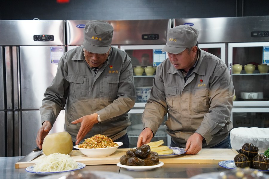 Staff members demonstrate pickle-making skills at the workshop of Liubiju, a pickle-making brand, in Beijing, capital of China, Jan. 31, 2023. (Xinhua/Wei Hongyi)