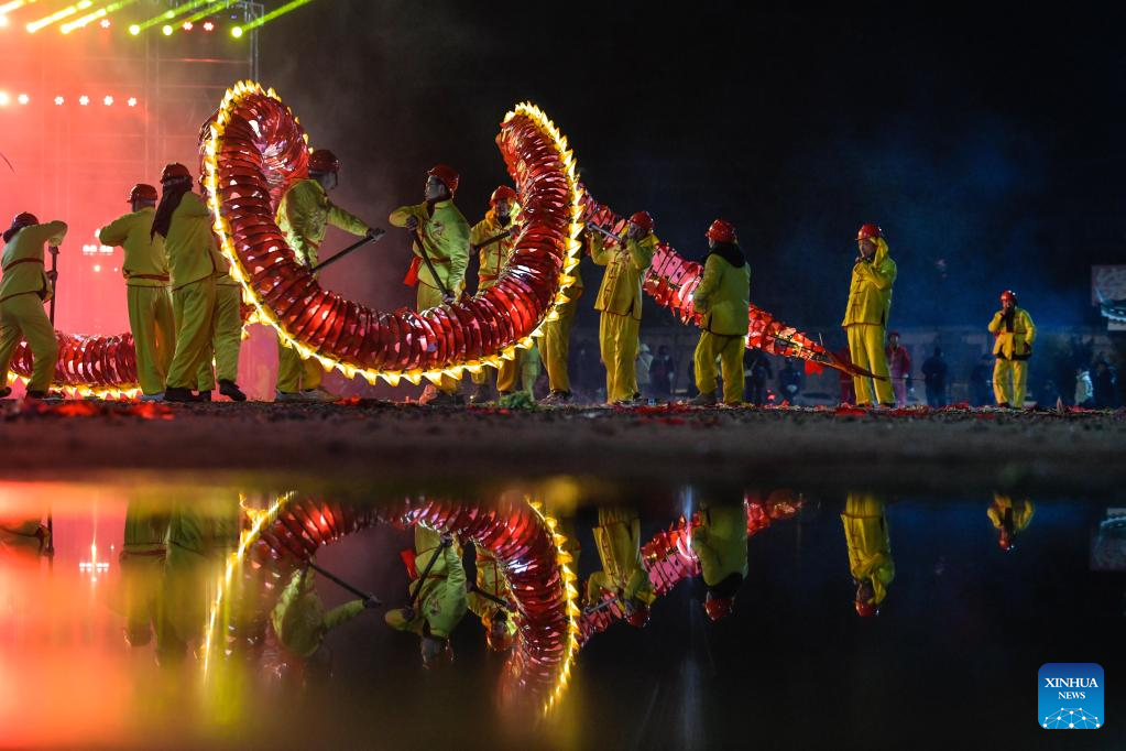 People perform dragon dance in Meitan County, Zunyi City, southwest China's Guizhou Province, Feb. 5, 2023. Various events are held across the country to celebrate the Lantern Festival, the 15th day of the first month of the Chinese lunar calendar, which falls on Feb. 5 this year. (Photo by Luo Xinghan/Xinhua)
