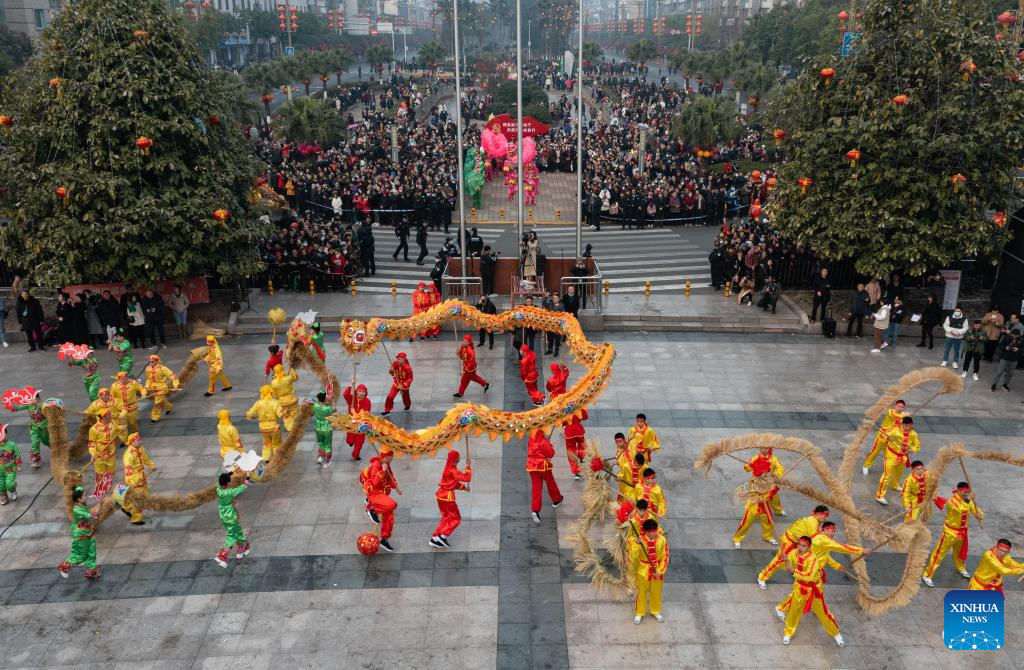 This aerial photo taken on Feb. 5, 2023 shows people performing dragon dance in Luxian County, southwest China's Sichuan Province. Various events are held across the country to celebrate the Lantern Festival, the 15th day of the first month of the Chinese lunar calendar, which falls on Feb. 5 this year. (Xinhua/Jiang Hongjing)