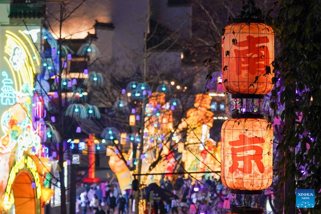 This photo taken on Feb. 4, 2023 shows a night view of a lantern fair at the Fuzi (Confucius) Temple scenic area in Nanjing, east China's Jiangsu Province. Lantern fairs and light shows were held to celebrate the Lantern Festival, which falls on Feb. 5 this year. (Xinhua/Li Bo)