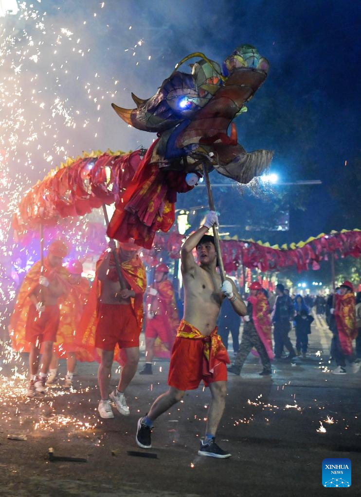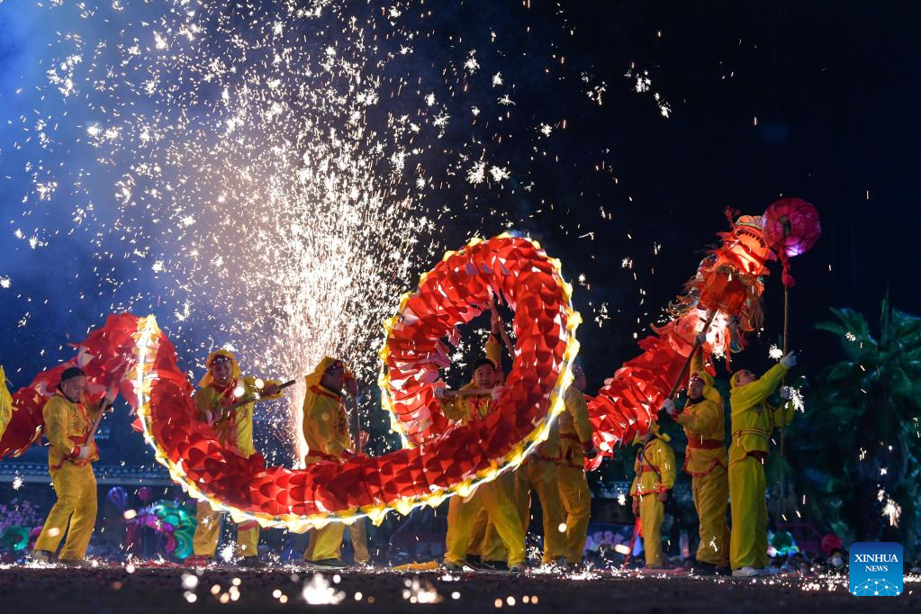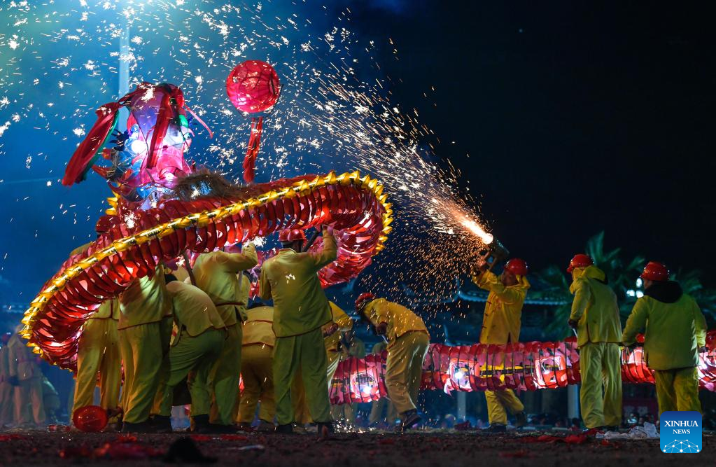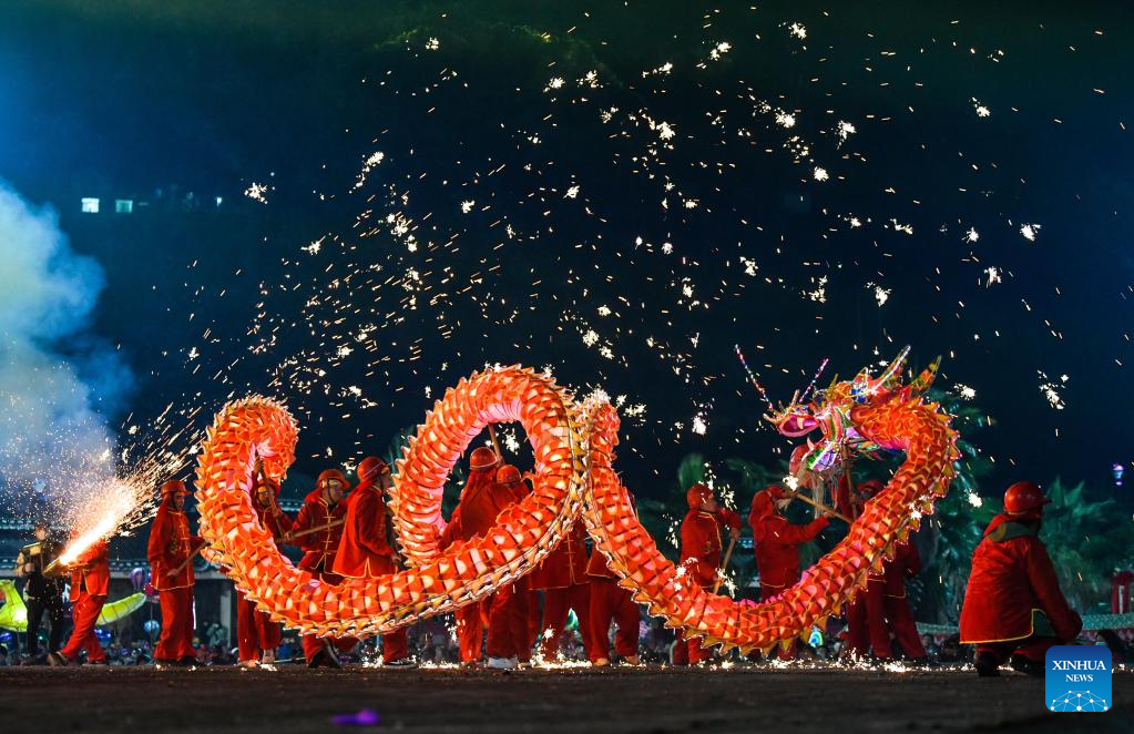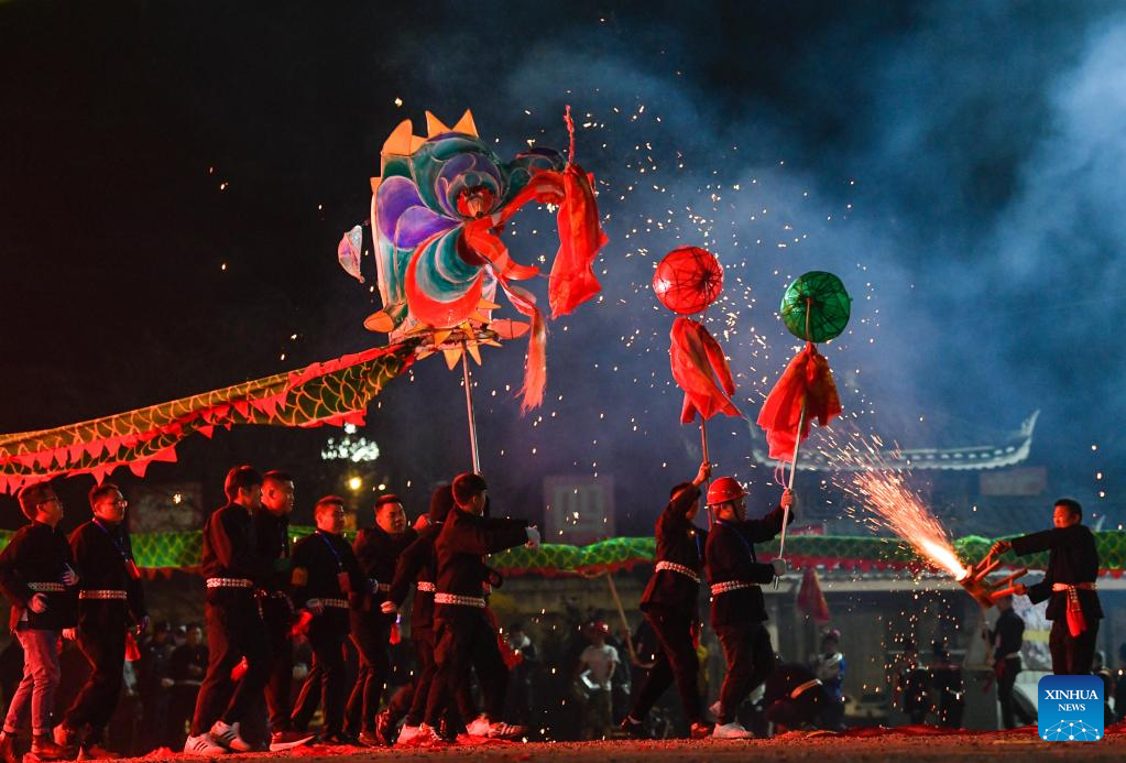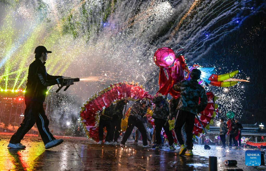 People perform "Wulong Xuhua" to celebrate the Lantern Festival in Taijiang County, southwest China's Guizhou Province, Feb. 4, 2023. The traditional "Wulong Xuhua" show is a kind of dragon dance performed amid fireworks by the Miao ethnic group. Local people of Taijiang County attended a "Wulong Xuhua" competition on the eve of the Lantern Festival, the 15th day of the first month of the Chinese lunar calendar, which falls on Feb. 5 this year. (Xinhua/Yang Wenbin)