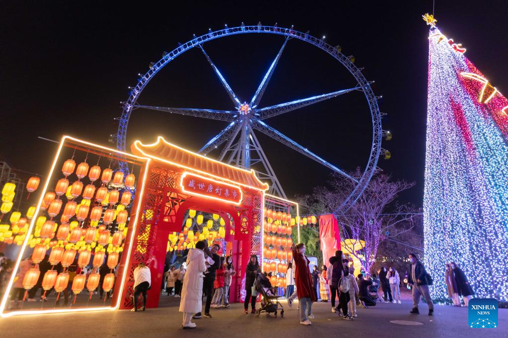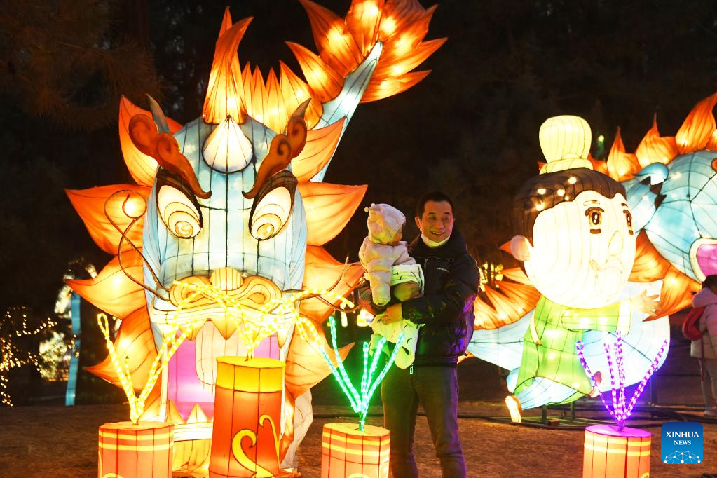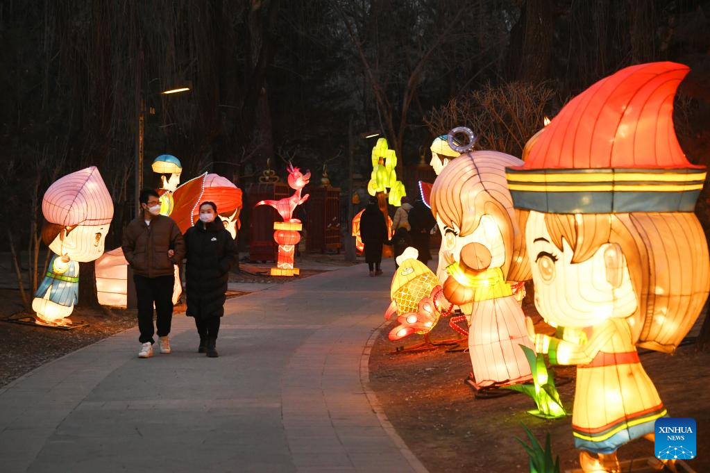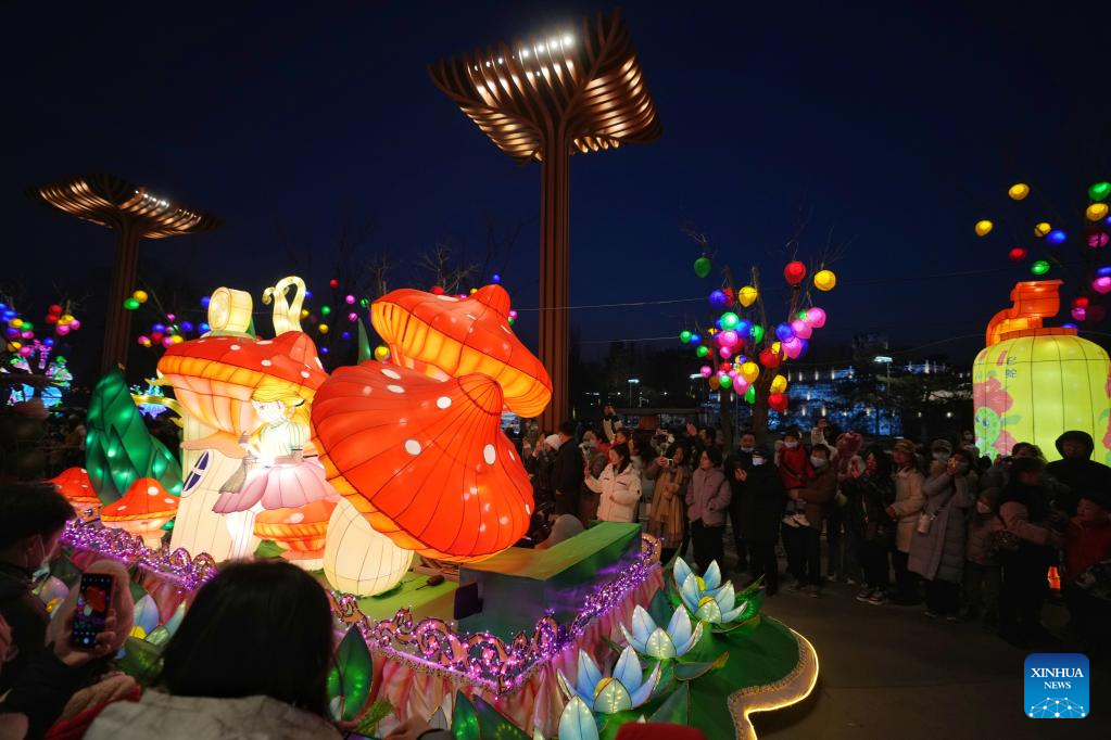 Tourists visit a light show at Nangong World Botanical Amusement Park in Beijing, capital of China, Feb. 5, 2023. Lantern fairs and light shows were held to celebrate the Lantern Festival, which falls on Feb. 5 this year. (Xinhua/Ren Chao)