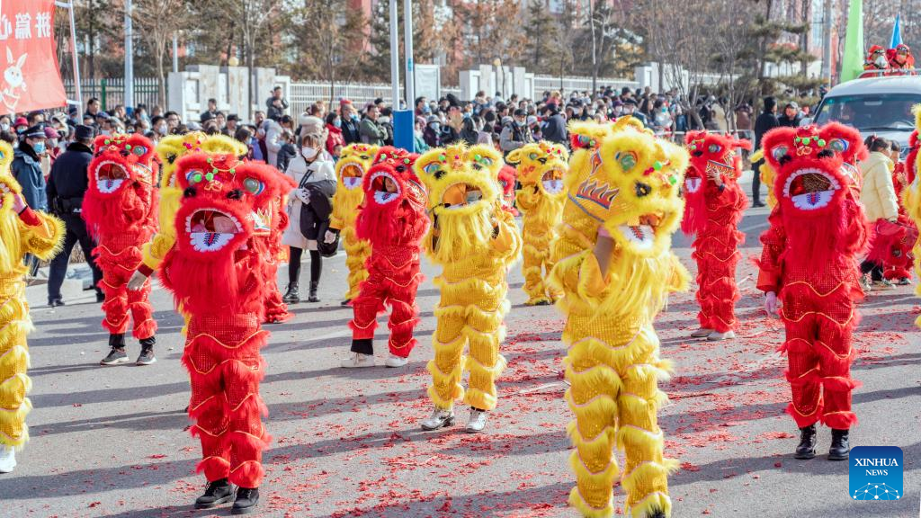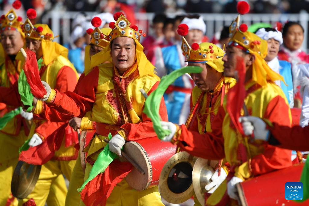 Folk artists perform "Dongbei Dagu", a folk art of drum music and recitative, at a country fair in Yingkou, northeast China's Liaoning Province, Feb. 5, 2023. People celebrate the Lantern Festival, the 15th day of the first month of the Chinese lunar calendar, with various traditional customs across the country. (Xinhua/Yao Jianfeng)