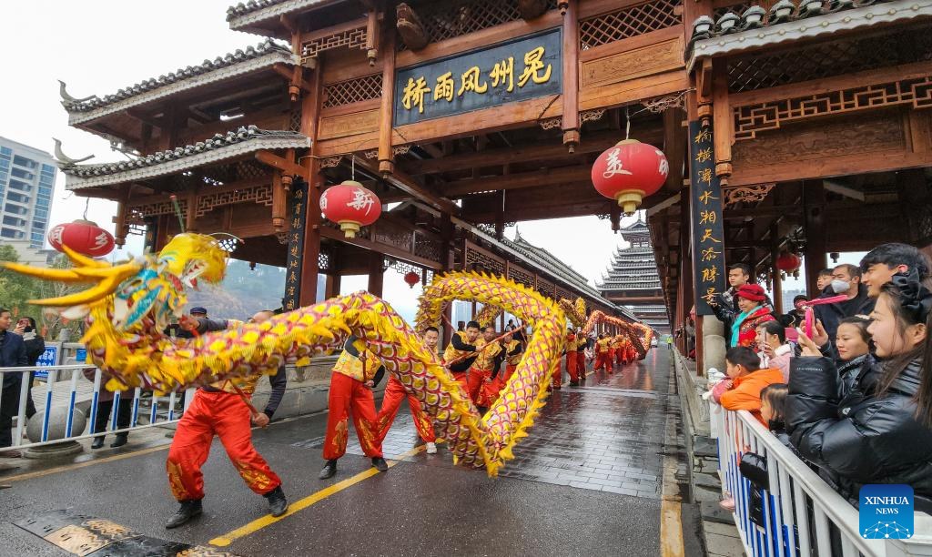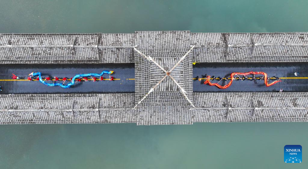 People perform "Wulong Xuhua" to celebrate the Lantern Festival in Taijiang County, southwest China's Guizhou Province, Feb. 4, 2023. (Xinhua/Yang Wenbin)