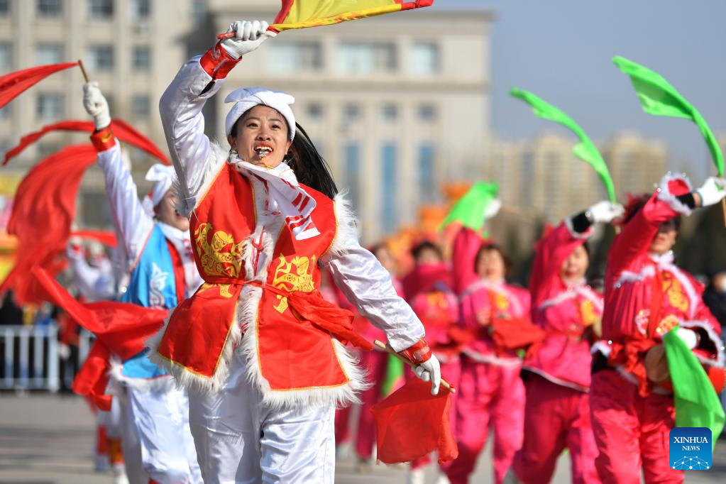 People perform traditional Yangge dance in Midong District in Urumqi, northwest China's Xinjiang Uygur Autonomous Region, Feb. 5, 2023. People celebrate the Lantern Festival, the 15th day of the first month of the Chinese lunar calendar, with various traditional customs across the country. (Xinhua/Wang Fei)