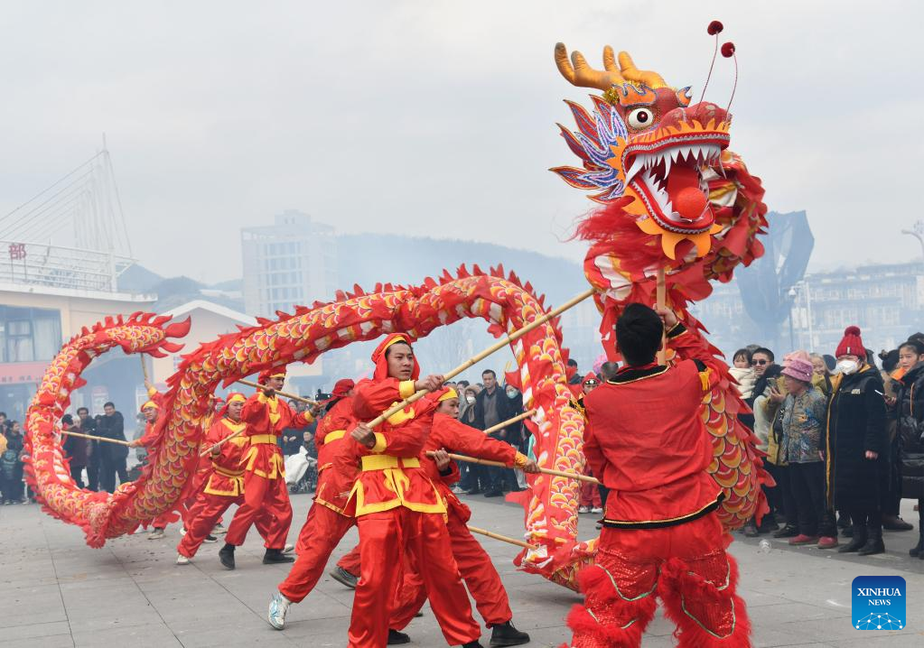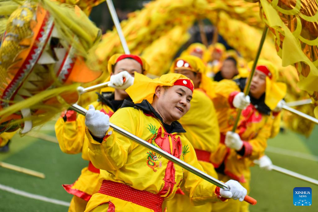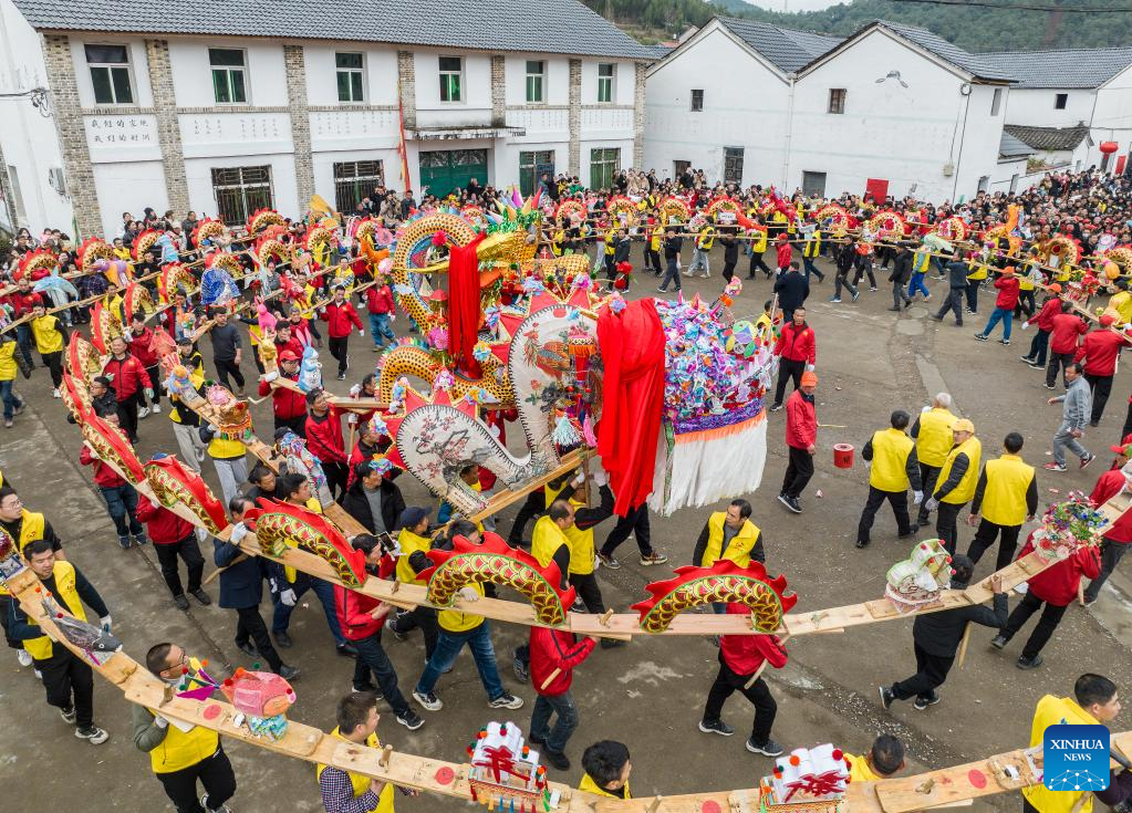 People perform dragon dance in Niuchang Village of Meitan County, Zunyi City, southwest China's Guizhou Province, Feb. 5, 2023. Various events are held across the country to celebrate the Lantern Festival, the 15th day of the first month of the Chinese lunar calendar, which falls on Feb. 5 this year. (Photo by Li Renjun/Xinhua)