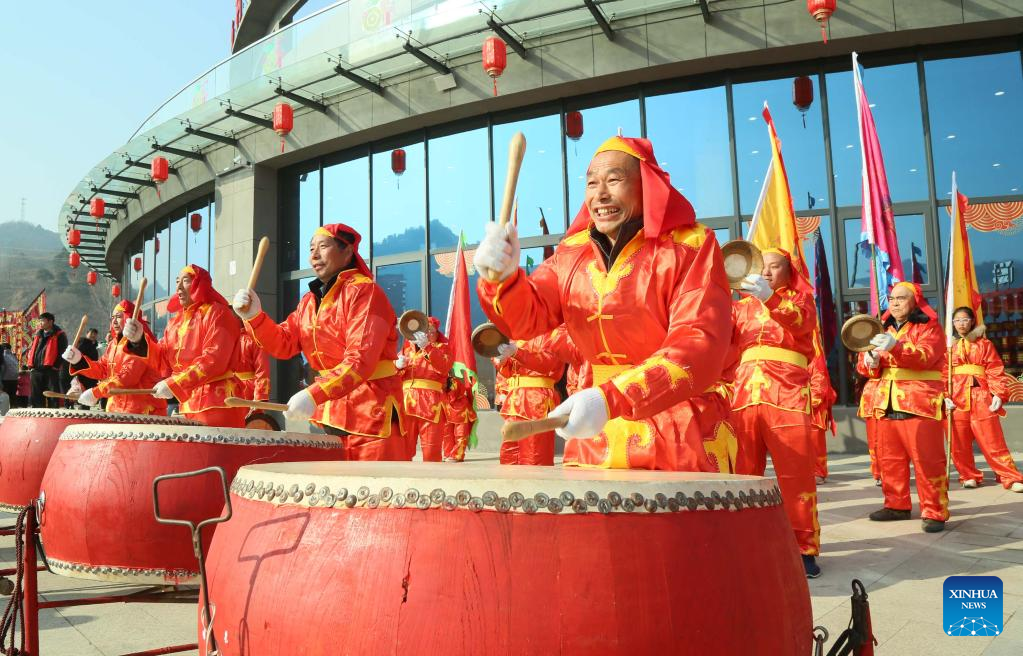 People perform folk drum dance in Baiyin City, northwest China's Gansu Province, Feb. 5, 2023. People celebrate the Lantern Festival, the 15th day of the first month of the Chinese lunar calendar, with various traditional customs across the country. (Xinhua/Chen Bin)