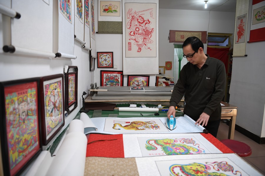 A man mounts a woodblock New Year painting at a workshop in Wuqiang County, north China's Hebei Province, Feb. 3, 2023. (Xinhua/Mu Yu)