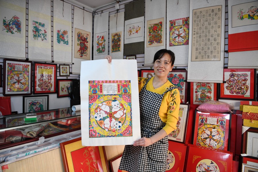A woman displays a woodblock New Year painting at a workshop in Wuqiang County, north China's Hebei Province, Feb. 3, 2023. (Xinhua/Mu Yu)