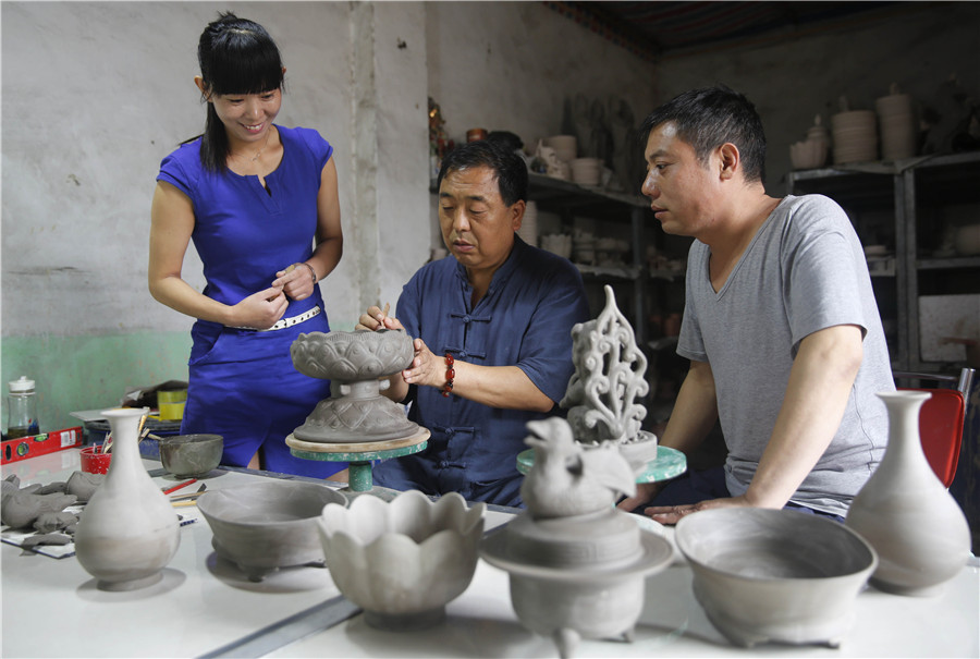 Wang Junzi, a national-level inheritor of Ru porcelain firing skills, teaches his disciples how to trim a ceramic body in Qingliangsi village, Baofeng county of central China's Henan Province, on June 3, 2016. (Photo/Xinhua)