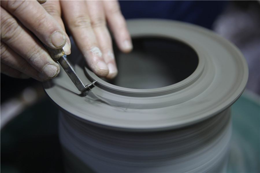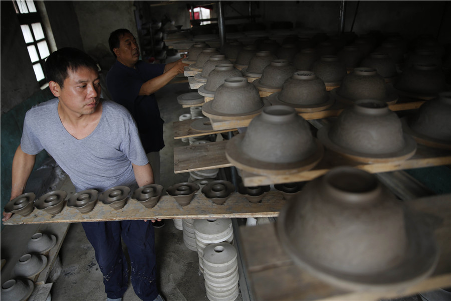 Wang Junzi trims a ceramic body in Qingliangsi village, Baofeng county of central China's Henan Province, on June 3, 2016. (Photo/Xinhua)