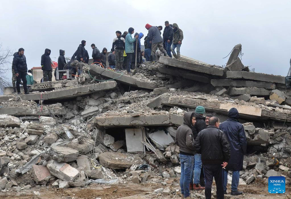 People search for survivors among the rubble of a building destroyed in a powerful earthquake in the city of Jableh, Latakia province, Syria, on Feb. 6, 2023. According to the Syrian health ministry and the Britain-based pro-rebel Syrian Observatory for Human Rights, a 7.7-magnitude earthquake jolted the northern Syrian provinces of Latakia, Tartous, Hama, Aleppo and Idlib on Monday, killing at least 870 and injuring 1,326. (Str/Xinhua)