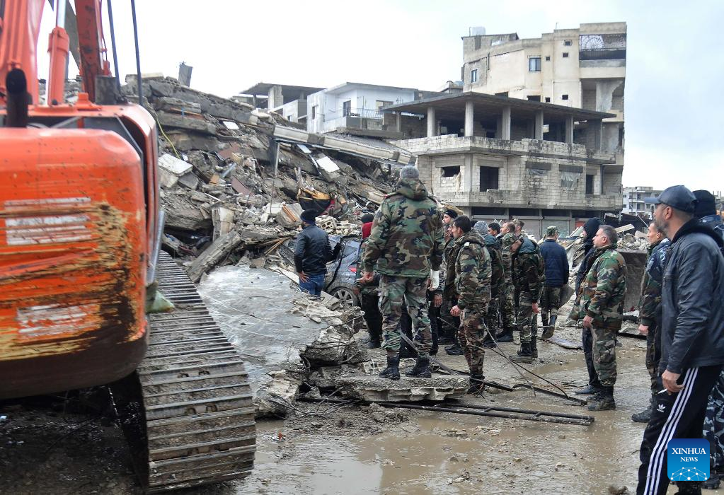 Rescuers work near the rubble of a building destroyed in a powerful earthquake in the city of Jableh, Latakia province, Syria, on Feb. 6, 2023. According to the Syrian health ministry and the Britain-based pro-rebel Syrian Observatory for Human Rights, a 7.7-magnitude earthquake jolted the northern Syrian provinces of Latakia, Tartous, Hama, Aleppo and Idlib on Monday, killing at least 870 and injuring 1,326. (Str/Xinhua)