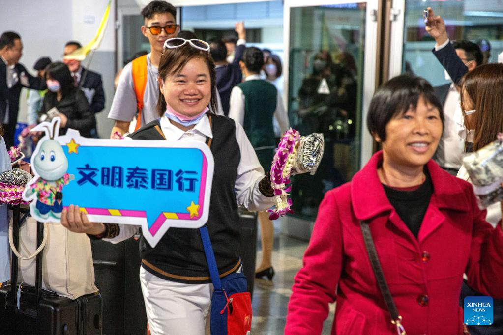 BANGKOK, Feb. 6 (Xinhua) -- Three years after the pandemic, the first tour groups from China arrived Monday in the Thai capital of Bangkok, greeted by flowers and a warm welcome from the Southeast Asian country betting on tourists' return to boost the recovery of its vital tourism sector.