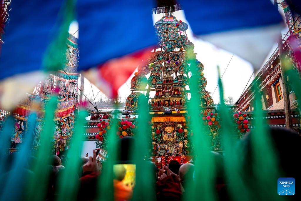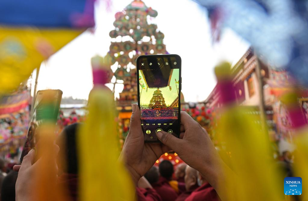 People take pictures of butter sculptures at the Taer Monastery in Huangzhong District of Xining, northwest China's Qinghai Province, Feb. 5, 2023. The butter sculptures are handmade by lamas in shapes of Buddha figurines, trees, flowers, birds and animals. (Xinhua/Liu Jinhai)