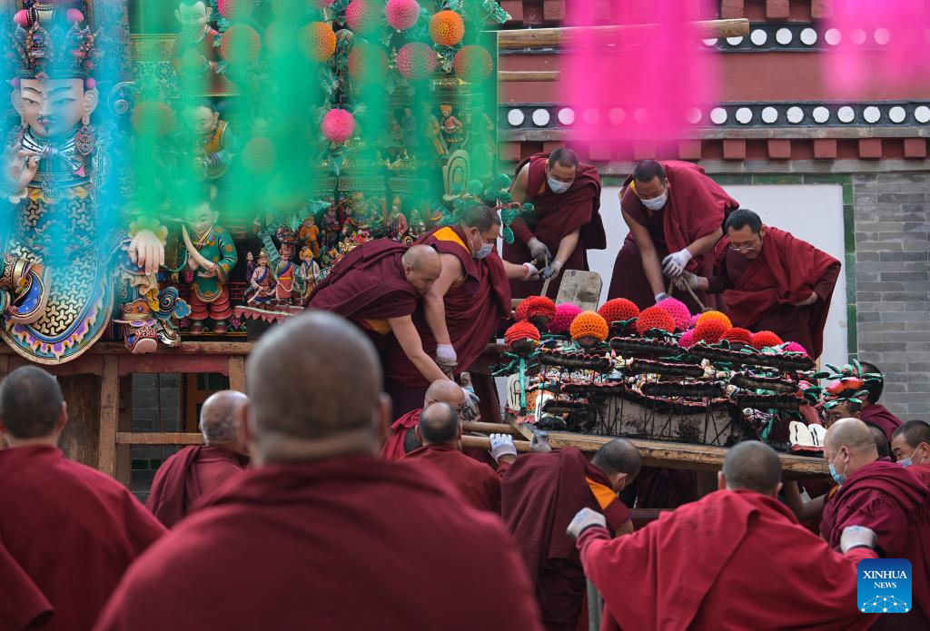 Lamas prepare an exhibition of butter sculptures at the Taer Monastery in Huangzhong District of Xining, northwest China's Qinghai Province, Feb. 5, 2023. The butter sculptures are handmade by lamas in shapes of Buddha figurines, trees, flowers, birds and animals. (Xinhua/Liu Jinhai)
