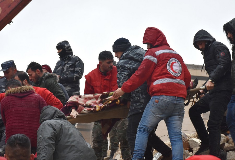 People transfer a victim of a powerful earthquake in the al-Arbaeen neighborhood in Hama province, Syria, on Feb. 6, 2023. (Str/Xinhua)