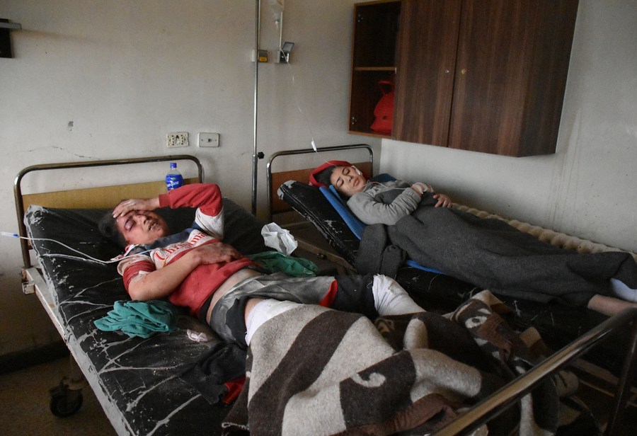 People injured in a powerful earthquake are treated at a hospital in Hama province, Syria, on Feb. 6, 2023. (Str/Xinhua)