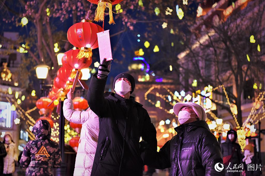 Visitors admire the illuminated lanterns, and try to solve the riddles hanging below them, on the Central Street of Harbin, northeast China’s Heilongjiang Province, on Feb. 2, 2023. (People’s Daily Online/Su Jinggang)
