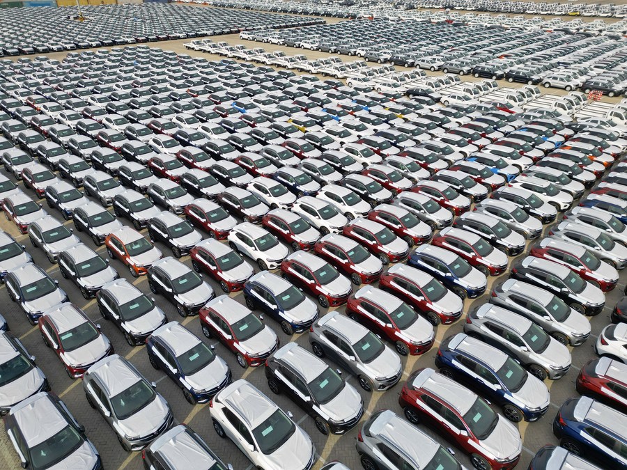 This aerial photo taken on Jan. 17, 2023 shows export vehicles waiting for shipment at Yantai Port, east China's Shandong Province. (Photo by Tang Ke/Xinhua)