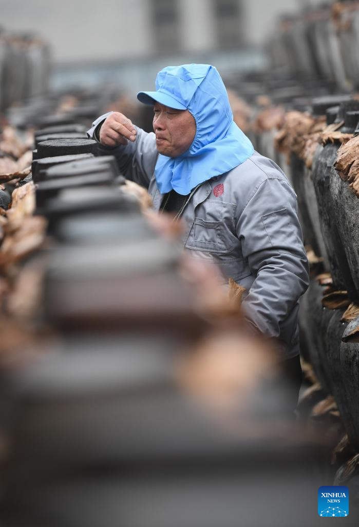 A worker seals wine crocks with mud at a rice wine brewery in Yuecheng District of Shaoxing, east China's Zhejiang Province, Feb. 7, 2023. (Xinhua/Weng Xinyang)
