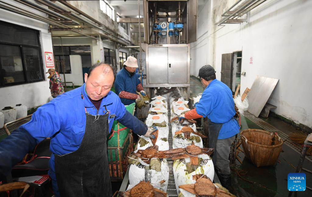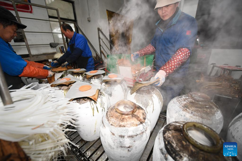 Workers seal wine crocks with lotus leaves and bamboo shells at a rice wine brewery in Yuecheng District of Shaoxing, east China's Zhejiang Province, Feb. 7, 2023. (Xinhua/Weng Xinyang)