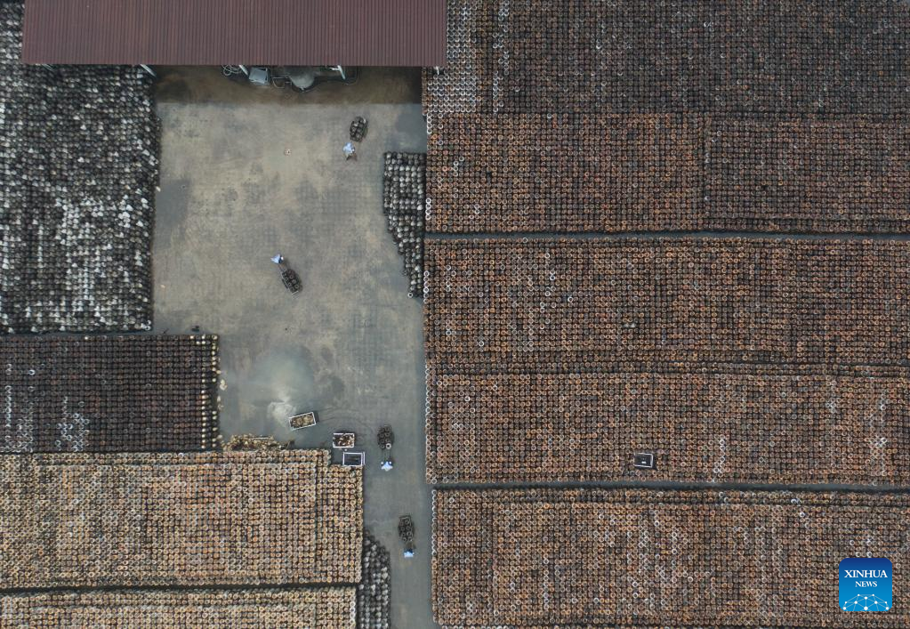 This aerial photo taken on Feb. 7, 2023 shows workers transporting crocks of wine at a rice wine brewery in Shangyu District of Shaoxing, east China's Zhejiang Province. (Xinhua/Weng Xinyang)