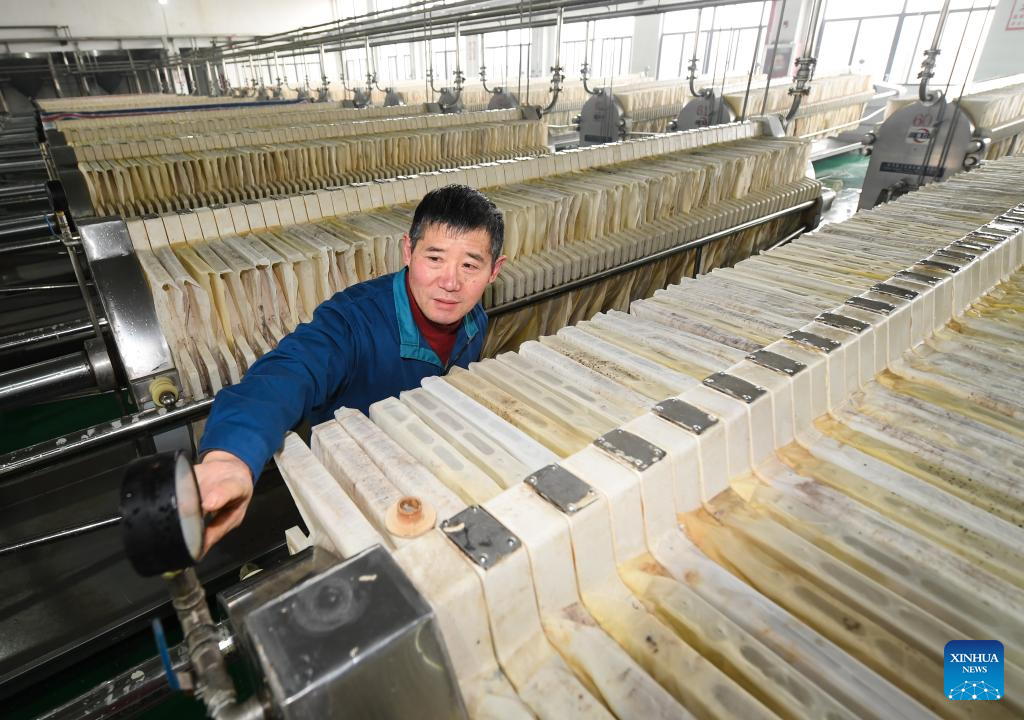 Winemaker Song Xinglei checks the feed pipe pressure at an extraction workshop of a rice wine brewery in Yuecheng District of Shaoxing, east China's Zhejiang Province, Feb. 7, 2023. (Xinhua/Weng Xinyang)