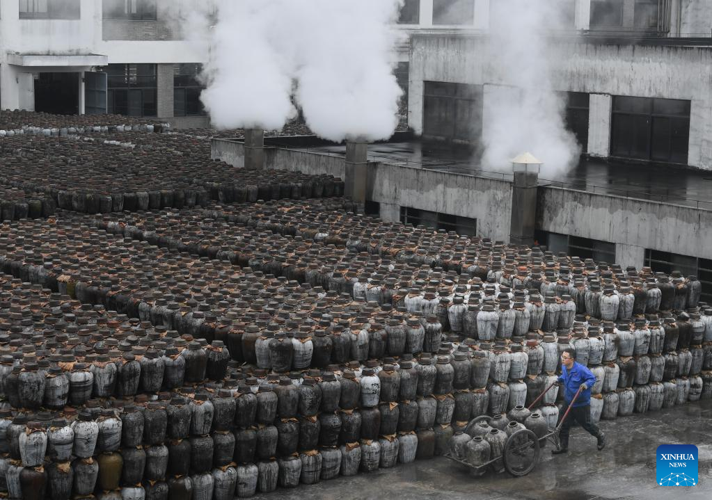 A worker transports crocks of wine at a rice wine brewery in Yuecheng District of Shaoxing, east China's Zhejiang Province, Feb. 7, 2023. (Xinhua/Weng Xinyang)