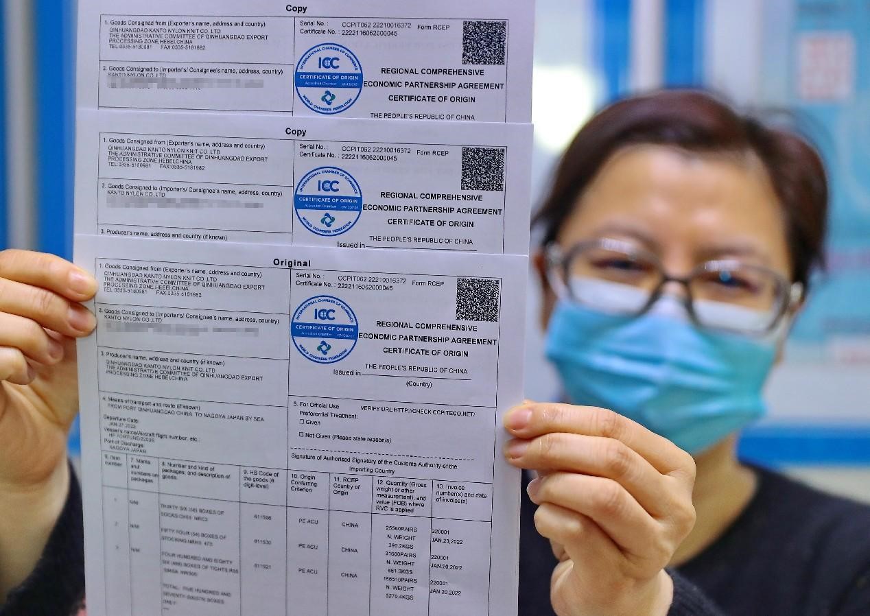 A worker with the Qinhuangdao Council for the Promotion of International Trade in Hebei province shows the first RCEP certificate of origin issued by the council, Jan. 28, 2022. (People's Daily Online/Cao Jianxiong)