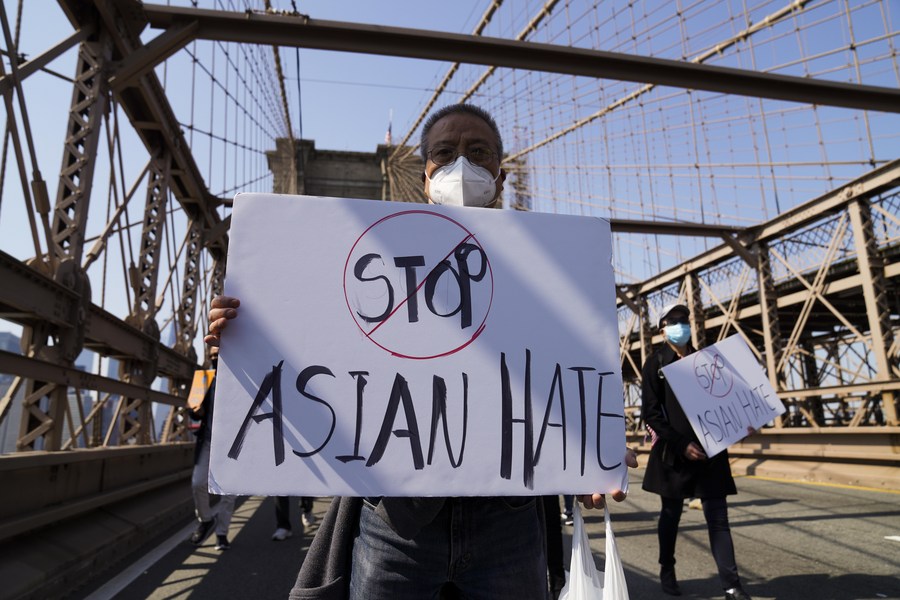 People march to protest against anti-Asian hate crimes on Brooklyn Bridge in New York, the United States, April 4, 2021. (Xinhua/Wang Ying)